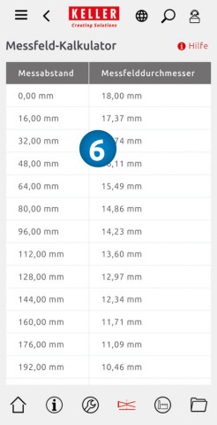 測定距離(2)と測定部の長さ(3)を入力すると、結果として測定面(4)と視野(5)の寸法がグラフィカルに表示され、テーブル(6)に出力されます。パイロメーターにアタッチメントレンズを使用する場合は、リスト(1)から選択する必要があります。